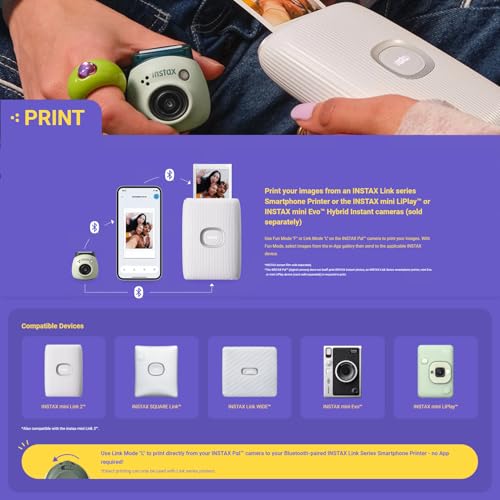 - طباعة متعددة الاستخدامات: اطبع مباشرة من أجهزتك المتوافقة مثل؛ طابعات الهواتف الذكية من سلسلة انستاكس لينك، كاميرات انستاكس ميني ليبلاي، كاميرات انستاكس ميني ايفو هايبرد الفورية مع اتصال البلوتوث، مما يجعل من السهل طباعة لقطات المفضلة لديك. ملاحظة: لا يقوم جهاز INSTAX PAL بنفسه بطباعة الصور الفورية من انستاكس.