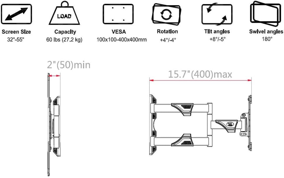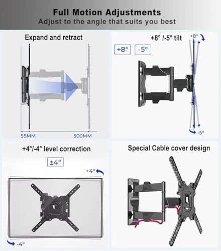 Generic - حامل جداري للتلفاز ذو الحركة الكامله لمعظم شاشات الكمبيوتر وأجهزة التليفزيون 32-55 بوصة - إمالة قابلة للتعديل ، تدوير.وزن يصل إلى 60 رطلاً (32 بوصة إلى 55 بوصة)