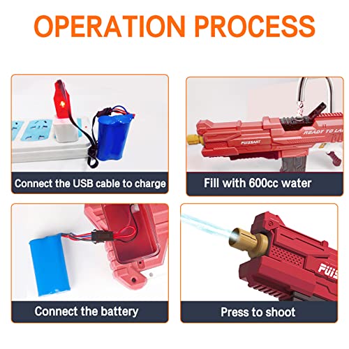 - ضغط عالي وقوي: تدفق المياه الذي يتم إطلاقه من مسدس الماء سريع جدًا لأن المحرك القوي والبطارية مجهزان بالداخل.