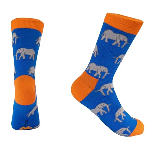 Kheyoot - جوارب طويلة بنمط فيل ممتع، ازرق وبرتقالي، مزيج من القطن، تصميم طباعة حيوانات مبتكرة، مقاس واحد