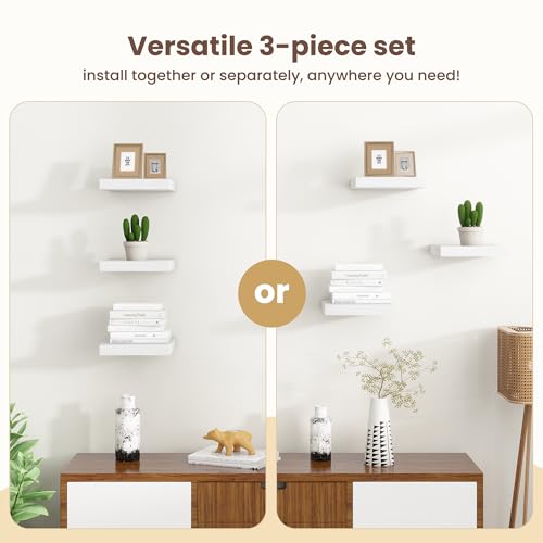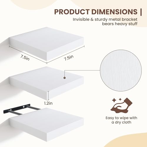 Fun Memories - ارفف عائمة للحائط من فن ميموريز - ارفف مربعة 7.5 انش مع دعامات غير مرئية، رف حائط صغير لغرفة المعيشة والحمام وغرفة النوم وديكور المطبخ، ابيض، مجموعة من 3 قطع