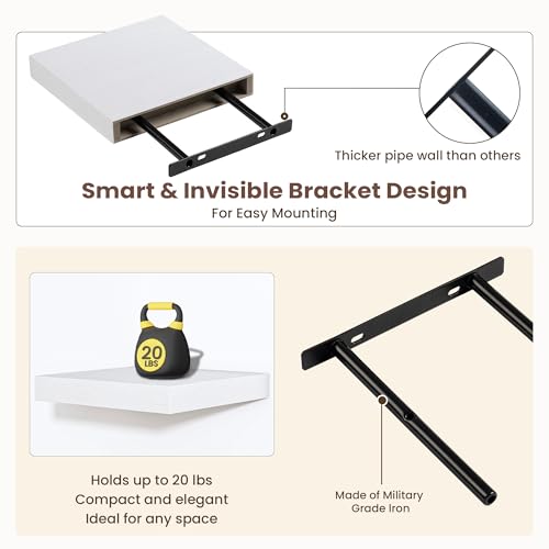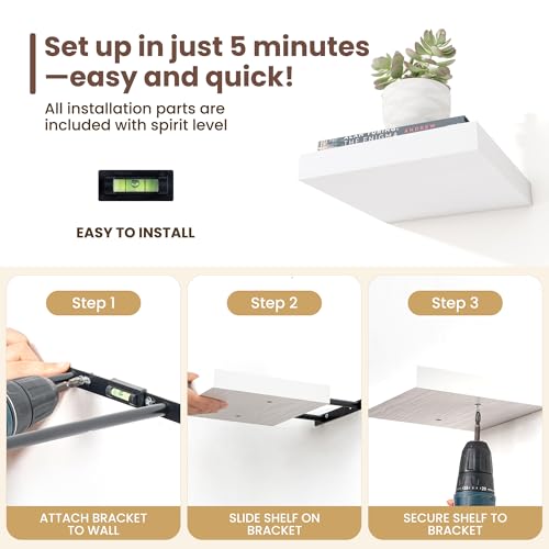 - نظام دعامة غير مرئية: كل رف مدعوم بنظام دعامة غير مرئي، مما يخلق تأثيرًا "عائمًا" يعزز المظهر الأنيق والعصري لمساحتك. تعمل الدعامات المخفية على التخلص من الأجهزة المرئية مع توفير دعم قوي، حيث يتحمل كل رف ما يصل إلى 8 باوند دون المساس بالاستقرار.