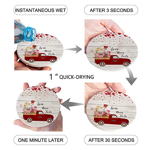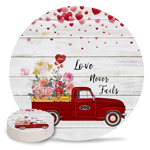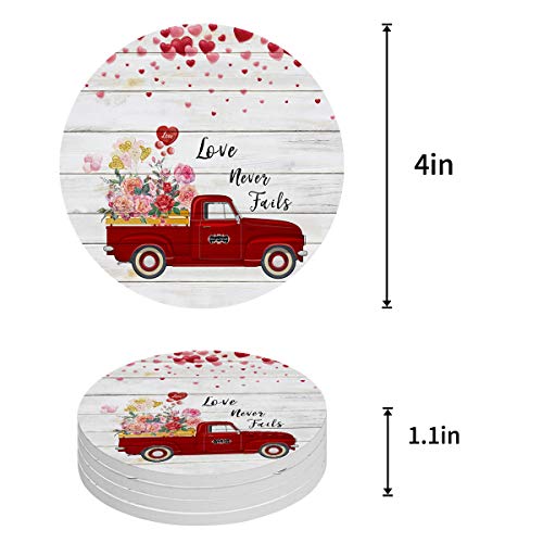 FunDecorArt - قاعدة أكواب سيراميك ماصة لمنع الانسكاب مع وسادة فلين، تصميم شاحنة حمراء سعيدة مزينة بالورود على لوح خشبي كلاسيكي ريترو من فن ديكور ارت، مجموعة 6 قطع