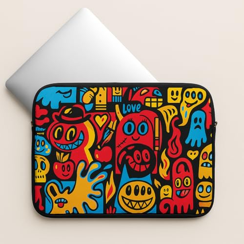 - تصميم نابض بالحياة: حافظة لاب توب لافتة للنظر تتميز بعمل فني وحش غير تقليدي بألوان حمراء وصفراء وزرقاء جريئة على خلفية سوداء مع شخصيات كرتونية مرحة