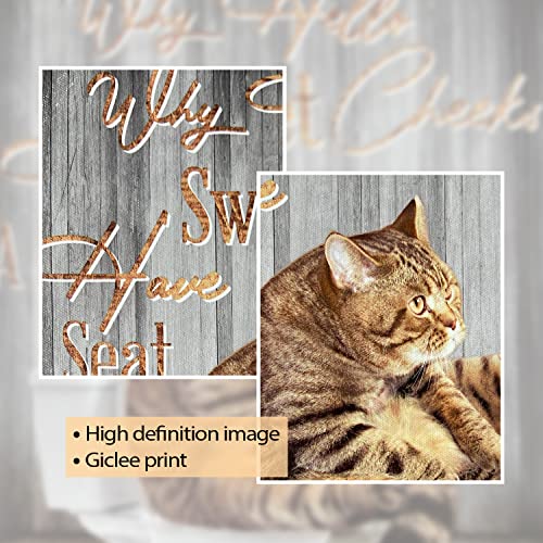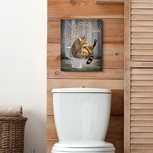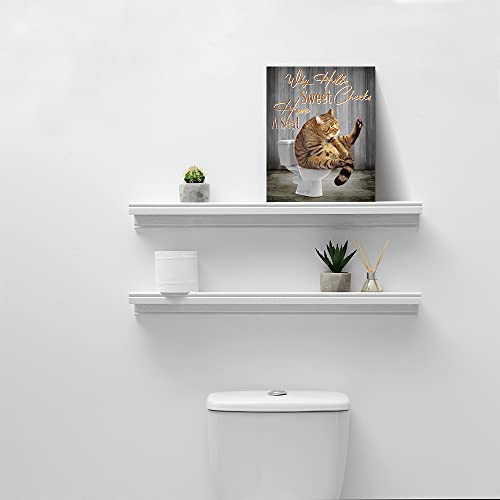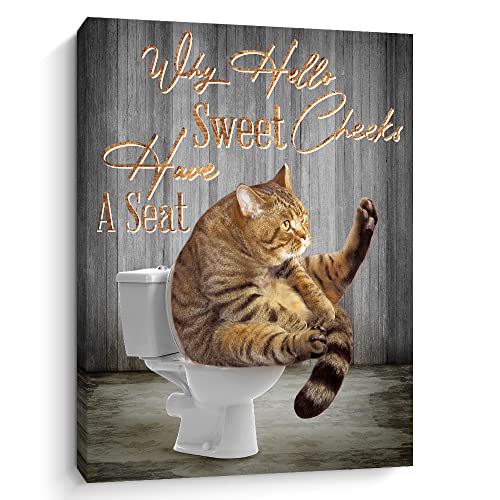 Creoate - لوحة فنية جدارية للحمام بتصميم قطة مضحكة من كريوات، لافتة قماش مطبوعة «Why Hello Sweet Cheeks» بنمط مغلف لحائط الحمام أو رف الحوض، مقاس 30 × 34.8 سم