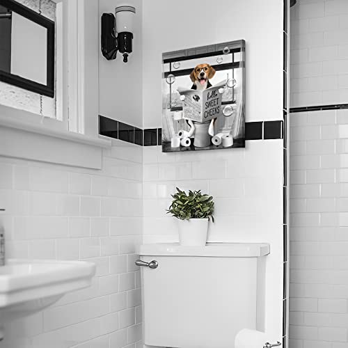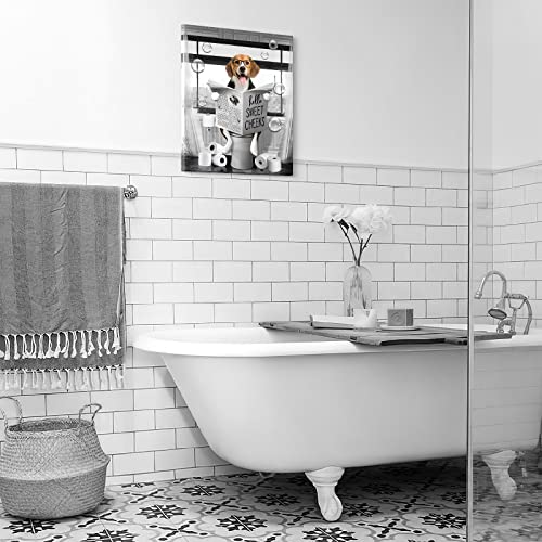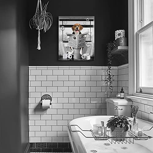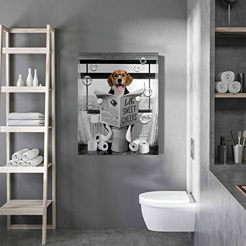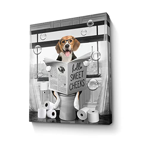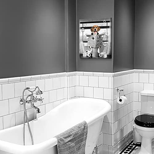 Parylore - لوحة فنية جدارية بتصميم مضحك لكلب بيجل باللونين الأبيض والأسود مطبوعة كلب يجلس على المرحاض ويقرأ الصحف مؤطرة للحمام 30 × 41 سم من باريلور