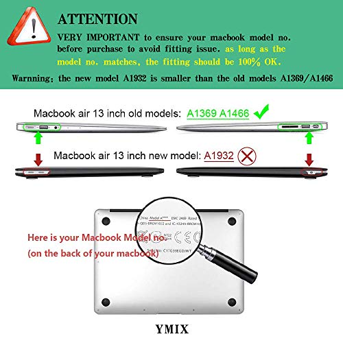 - حافظة ماك بوك اير 13 انش مصنوعة من البلاستيك الصلب لجهاز ماك بوك اير 13 انش A1466/A1369 (إصدار 2010-2017) بدون خاصية تاتش اي دي. يرجى التحقق من رقم الموديل "A1xxx" على ظهر اللاب توب قبل الشراء. تأكد من مطابقته لرقم الموديل في العنوان "A1466" أو "A1369". غير متوافق مع أي طراز سابق لجهاز ماك بوك برو.