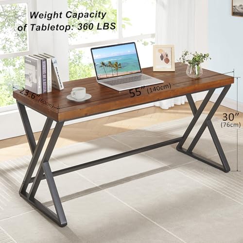 FurniChoi - مكتب كمبيوتر من الخشب الصلب من فورنيتشوي، مكتب منزلي حديث من الخشب الحقيقي، مكتب كتابة طويل من الخشب الطبيعي، محطة عمل تنفيذية لغرفة المعيشة وغرفة النوم، بني، 55 انش