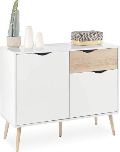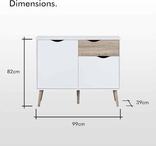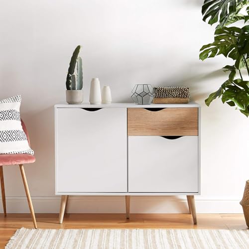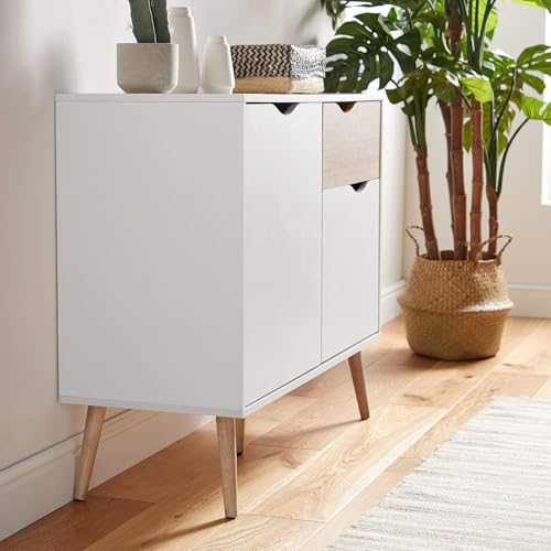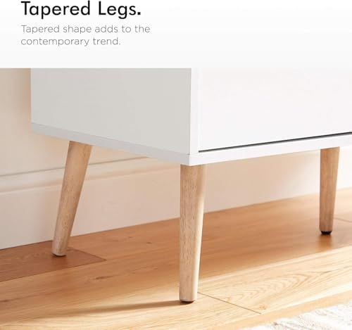 FurniFlex - دولاب جانبي مزين بنمط خشب البلوط الطبيعي بأربع أرجل بتصميم مدبب من فورني فليكس، أبيض