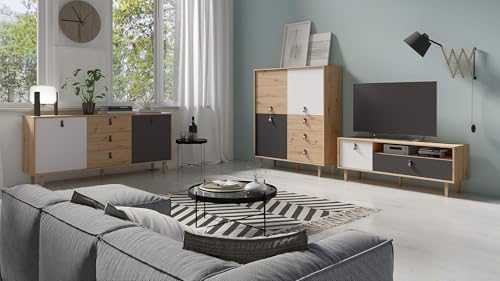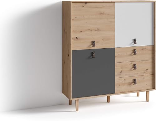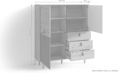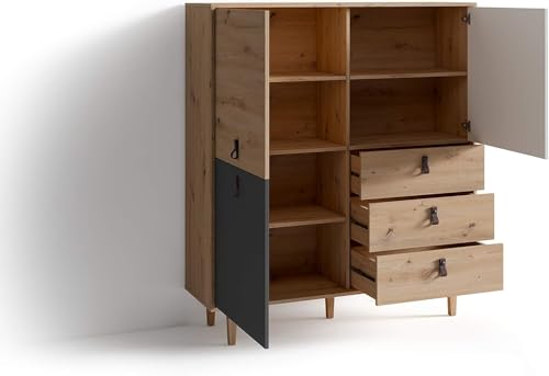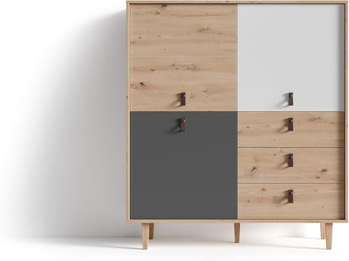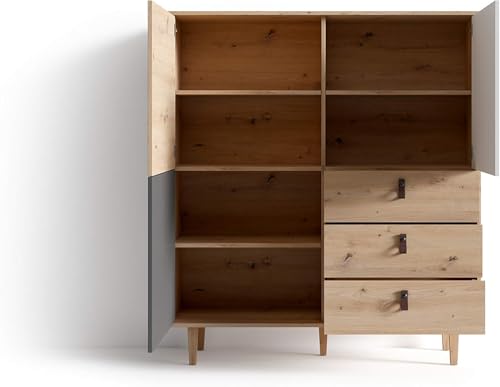 FurniFlex - خزانة بتصميم مرتفع لغرفة المعيشة من فورني فليكس من خشب البلوط الصناعي، تحتوي على 3 أبواب و3 أدراج، بحجم 120 × 135 × 36.5 سم، لون بني فاتح/ أبيض/ رمادي