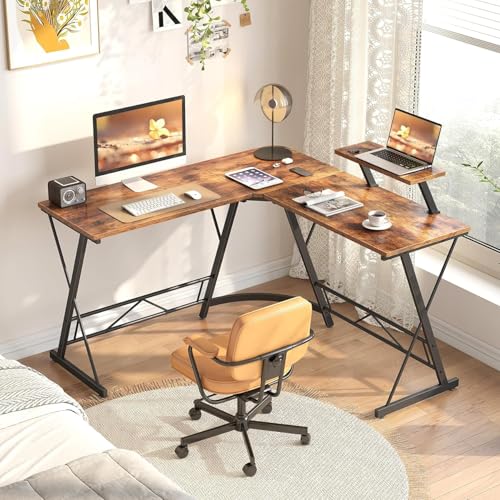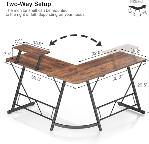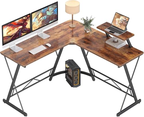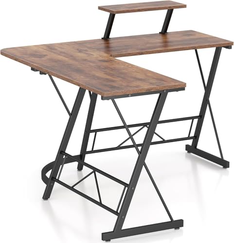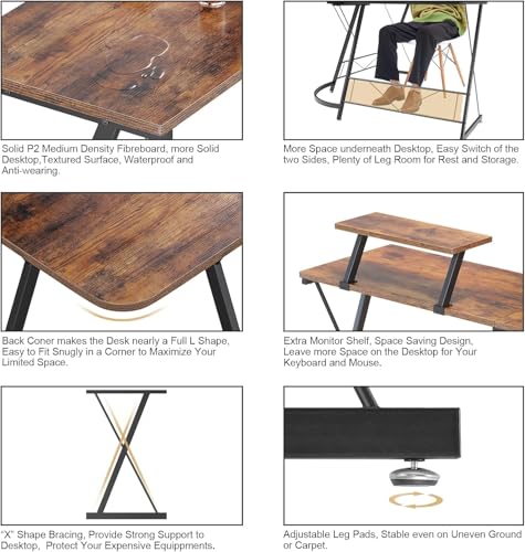 FurniFlex - مكتب كمبيوتر على شكل L مع حامل شاشة كبير من فيرني فلكس، بحجم 1.29 متر، باللون البني الريفي