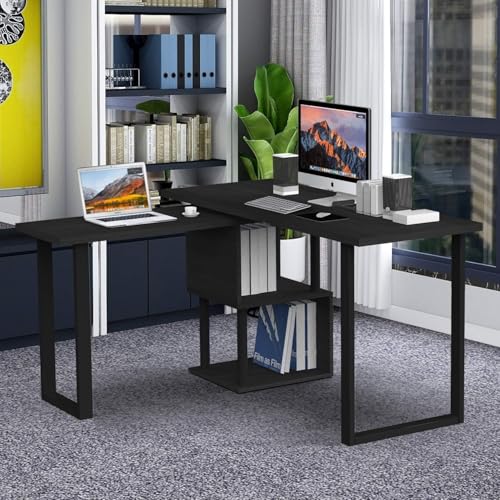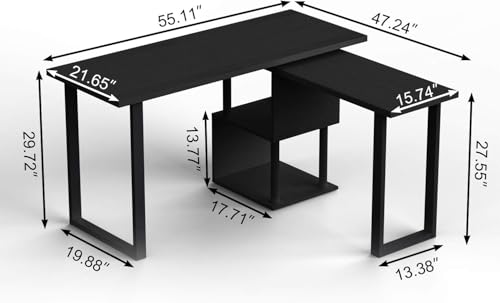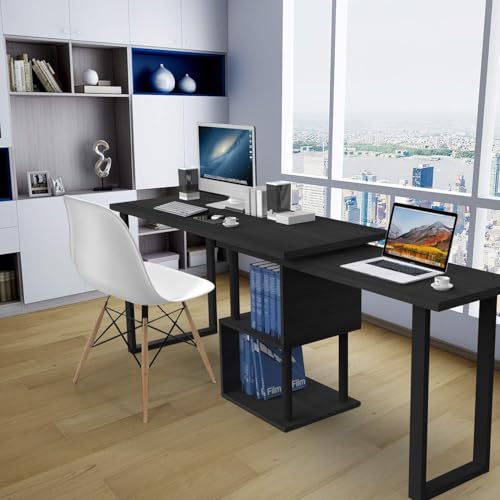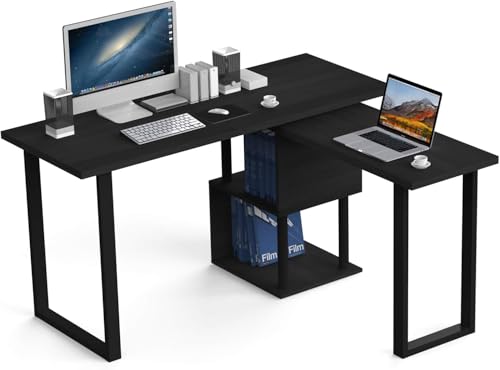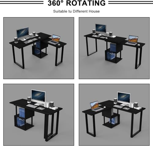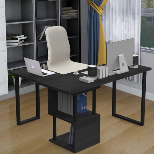 FurniFlex - مكتب كمبيوتر كبير على شكل حرف L مع رفوف تخزين من فورني فليكس، 1.4 م، أسود