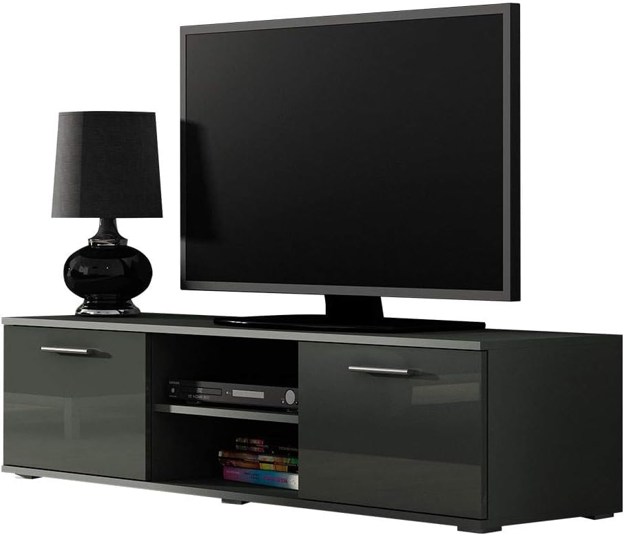 FurniFlex - وحدة حامل تلفزيون سوهو بتصميم عالي اللمعان، خزانة ترفيهية مع بابين من فيرني فلكس، مقاس 1.40 متر، لون رمادي