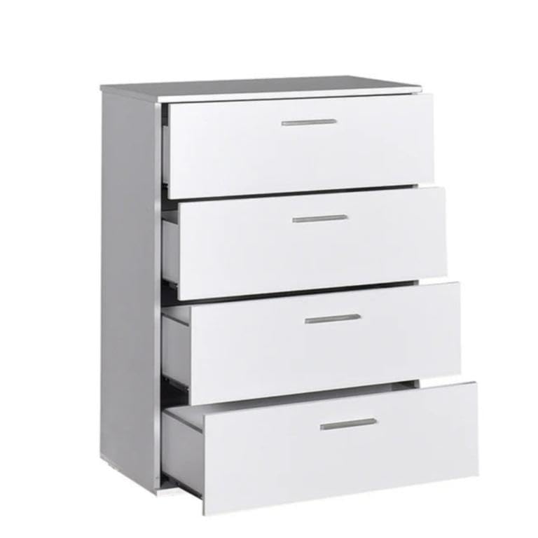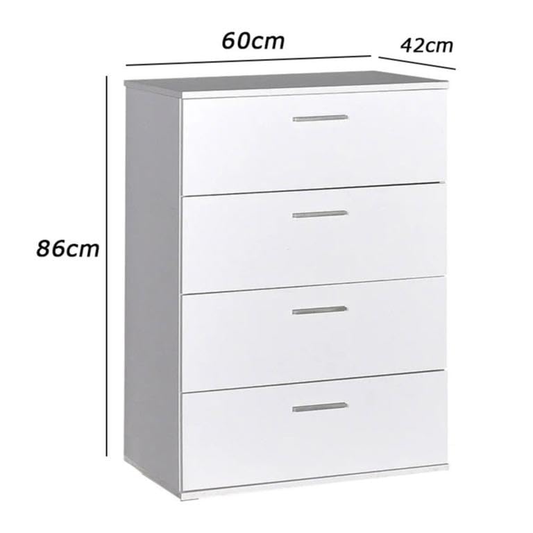 - وحدة ادراج مودرن ام دى اف - ارتفاع 86 سم - عرض 60 سم - عمق 42 سم ، تتكون من 4 ادراج ، مصنوعة من ال MDF عالي الجودة ، سُمك 16مم ، مع طبقة ملامين خارجية من اللون الأبيض المطفي. مع ميكنزم معدن (مجرة الدرج معدن 2 مرحلة) ، فنش عالي الجودة ، من فرنتشر ستور.