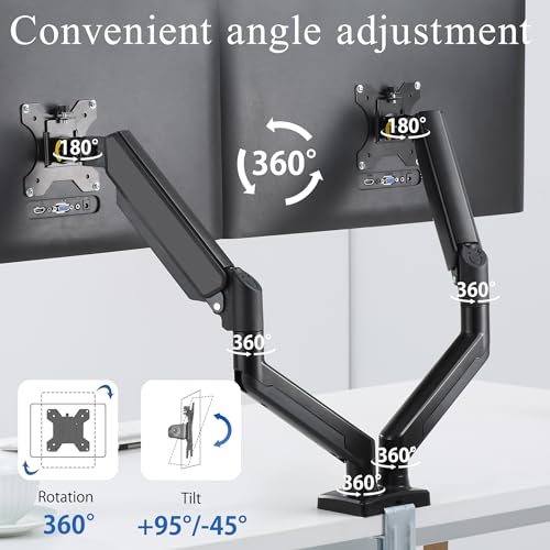 - قم بتعديل موضع شاشتك بسهولة تامة باستخدام ذراع الزنبرك الغازي. مع نطاق زاوية ميل يتراوح من -45° إلى +95° ودوران أفقي بزاوية 360°، يتيح هذا الذراع حركة سهلة في أي اتجاه. آلية الأسطوانة الهوائية تتيح تعديل الارتفاع، العمق، والزاوية بسرعة ومرونة، مما يجعل هذا الذراع إضافة فعالة ومريحة لمكان عملك.