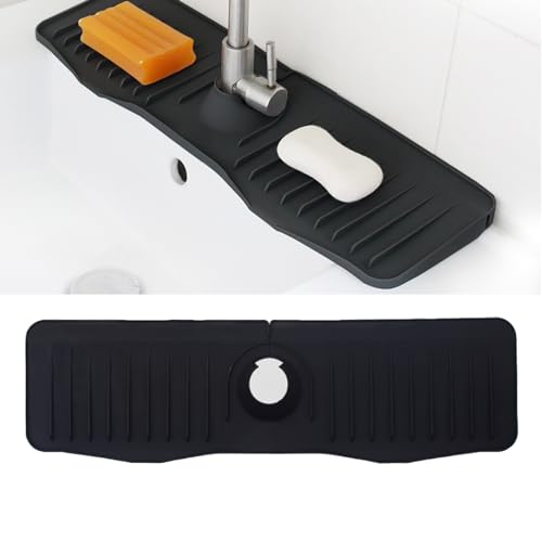 FZHOME - واقي الحوض، صينية التقاط التنقيط بمقبض صنبور من السيليكون، حصائر حوض المطبخ، واقي رذاذ الصنبور، سجاد تجفيف مانع للانزلاق للمطبخ (أسود، بلس) من إف زي هوم