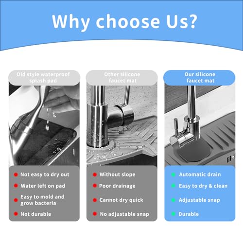 - ★【حافظ على سطح الطاولة جافًا】لقد عالجت وسادة الحنفيات السيليكونية هذه مشكلة المياه الزائدة حول الجوانب في مطبخك وحمامك. ستستمتع حقًا بعدم الحاجة إلى مسح الجزء الخلفي من الحوض عدة مرات في اليوم.