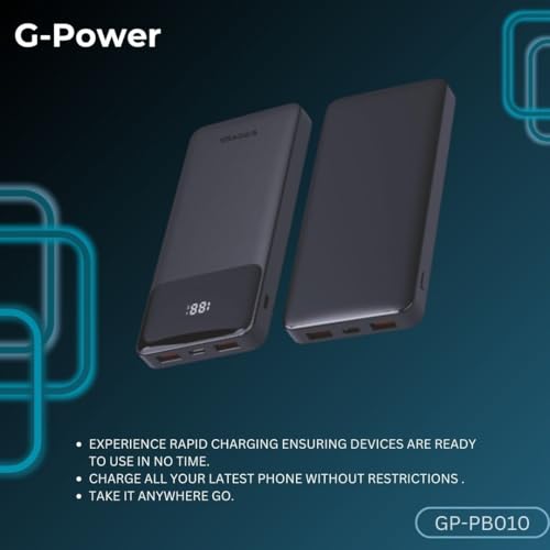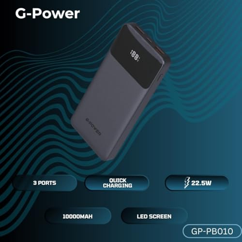 G-POWER - باور بانك من جي-باور سعة 10000 مللي أمبير بتقنية ليثيوم بوليمر ومنافذ USB و تايب-C مع شاشة LED وشحن سريع للهواتف و التابلت، أسود
