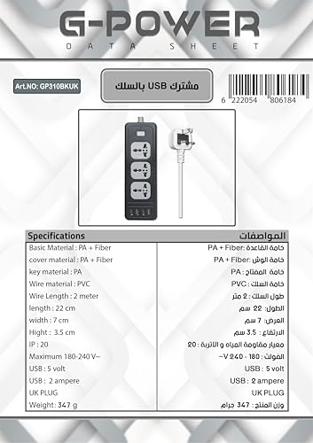 G-Power - مشترك كهربائي GP310BK بـ 4 منافذ USB وثلاثة فيش ثلاثية بطول 2 متر من جي باور - أسود
