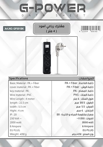 G-Power - مشترك كهربائي بسلك عالي الجودة مع قابس توصيل مزدوج و4 منافذ بطول 4 م من جي باور GP351BK - لون أسود