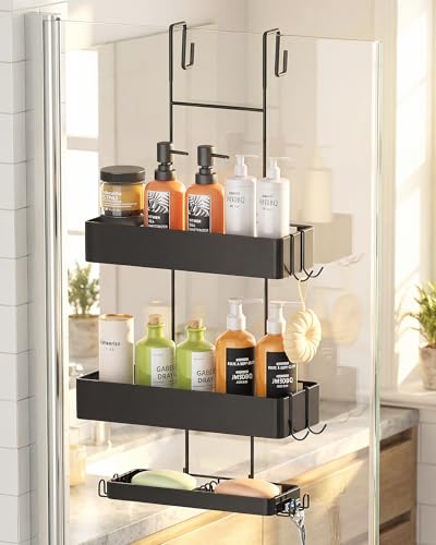 Gabeeriso - حامل دش معلق من جابيريسو - رف حمام اسود من 3 طبقات مقاوم للصدا مع 8 خطافات، منظم دش موفر للمساحة لتخزين الشامبو والصابون والمناشف (تخزين دش فوق الباب)