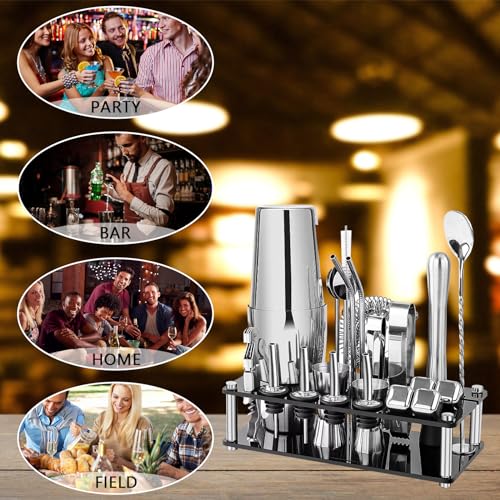 Gabrella - مجموعة زجاجات شيكر كوكتيل من جابريلا من 23 قطعة، مجموعة كوكتيل من الفولاذ المقاوم للصدأ مع حامل اكريليك مع شيكر بوسطن 750 مل ومصفاة ووعاء وملعقة خلط ومساكة وسدادات زجاجات وفتاحة ووصفات