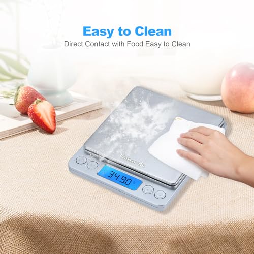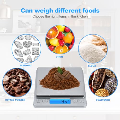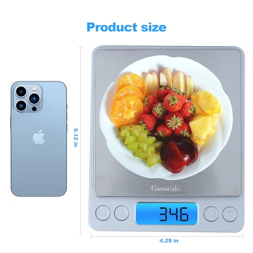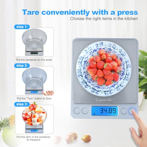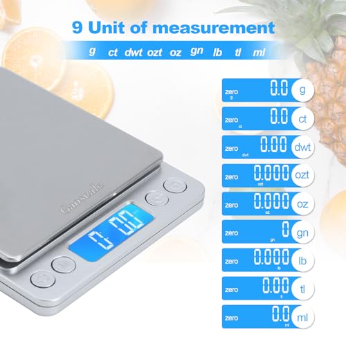 Gaoscale - ميزان مطبخ رقمي عالي الدقة للطبخ والخبز مع وظيفة التصفير بقدرة وزن حتى 3 كيلوجرام، دقة 0.1 جرام - يدعم 9 وحدات قياس، يأتي مع صينيتين من جاوسكيل