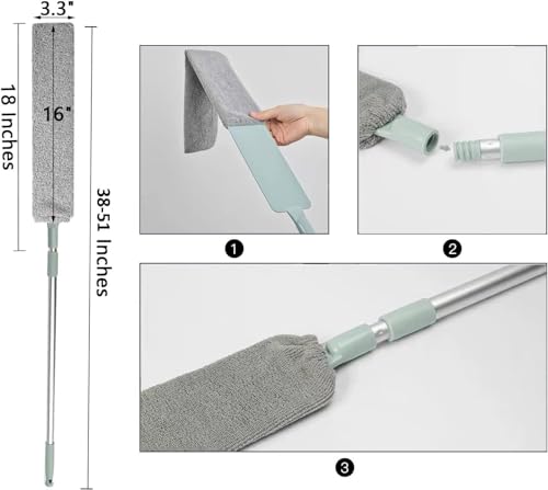 - [رأس قابل للانحناء والإزالة مجانًا]: منفضة التنظيف المرنة الطويلة ذات الرأس المسطحة هي أداة التنظيف المثالية للأماكن التي يصعب الوصول إليها. ينزلق التصميم المسطح الطويل بسهولة بين أجهزة المطبخ وغسالة الملابس والمجفف والدواليب العميقة وتحتها.