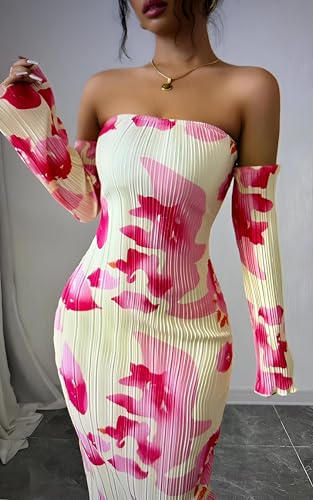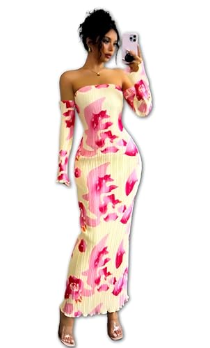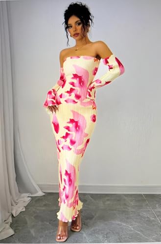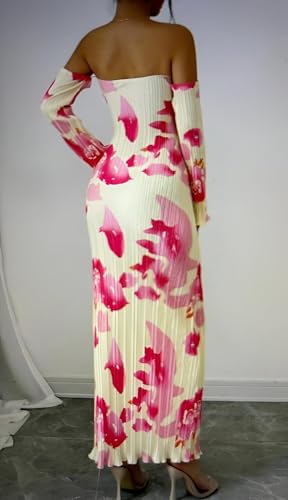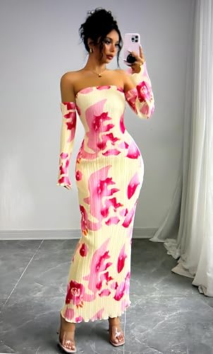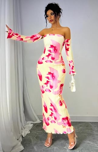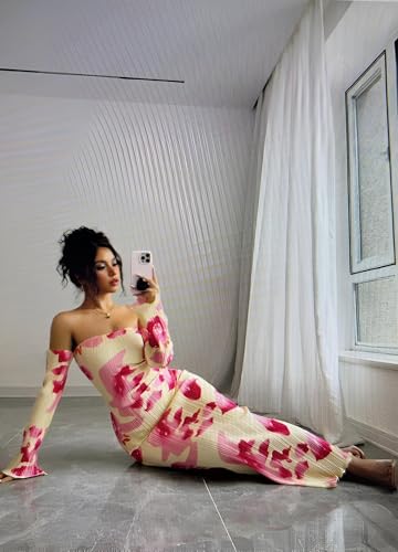 Generic - خزانة ملابس الحديقة - فستان بطباعة نباتية مع صورة ظلية جذابة وطيات رقيقة وتنورة طويلة فضفاضة واكمام جرس مميزة للايام المشمسة الرومانسية.