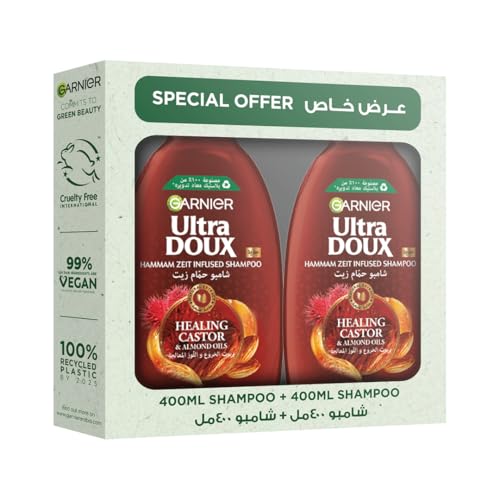 Garnier - شامبو الترا دوكس بزيت الخروع واللوز من جارنييه، 2 × 400 مل، للشعر الكل