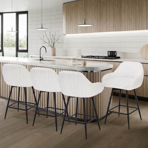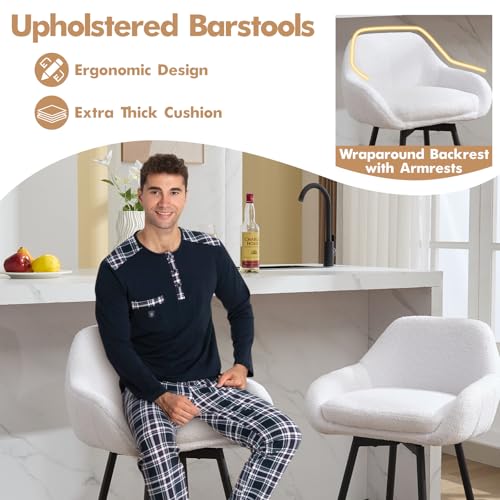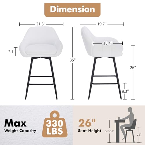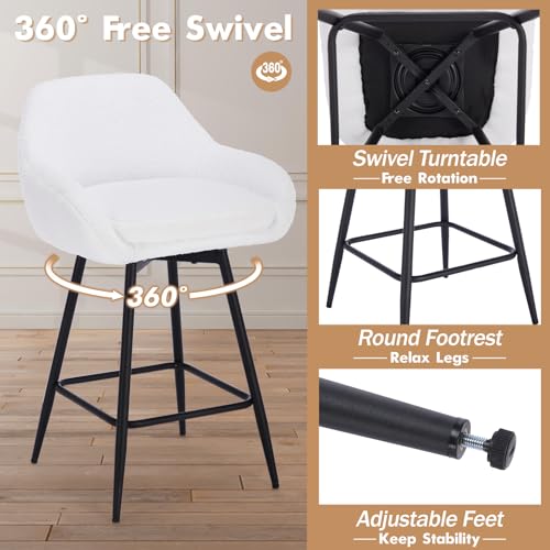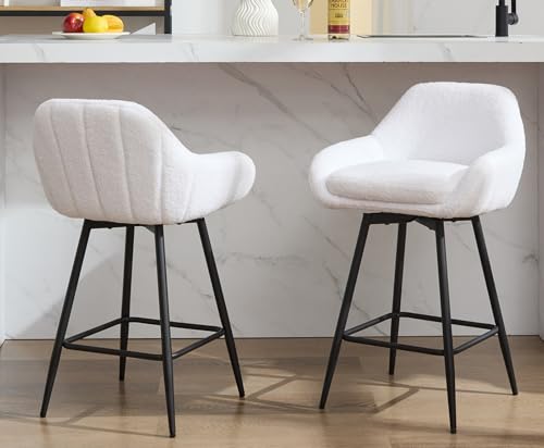 GarveeHome - مجموعة كراسي بار دوارة عصرية بارتفاع 26 انش من جارفي هوم، كراسي بار بارتفاع 26 انش لجزيرة المطبخ، كراسي بار منجدة من قماش الشيربا مع ظهر وارجل معدنية، ابيض