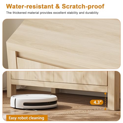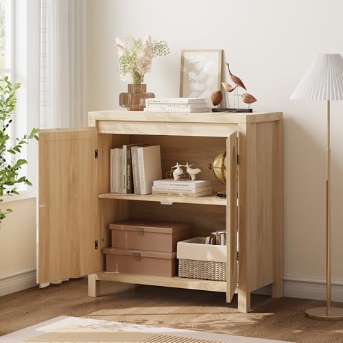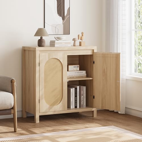 GarveeHome - بوفيه جانبي كلاسيكي، دولاب تخزين عصري بتصميم منتصف القرن مع مساحة تخزين، كونسول صغير مع رف قابل للتعديل وباب من الراتان لغرفة المعيشة وغرفة الطعام من جارفي هوم، لون طبيعي