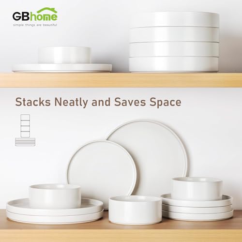 GBhome - طقم عشاء سيراميك لـ8 اشخاص من جي بي هوم، اطباق وبولات من الفخار مقاومة للكسر والخدش، امنة للاستخدام في غسالة الاطباق والميكروويف والفرن، لون ابيض لامع