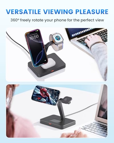 GEEKERA - قاعدة شحن لاسلكية مغناطيسية 3 في 1، شاحن لاسلكي سريع بقاعدة تثبيت متوافق مع آيفون 15 و14 و13 و12 برو ماكس وساعة آبل 2 و3 و4 و5 وSE و6 و7 و8 و9 وسماعات ايربودز 3 و2 وبرو من جيكيرا