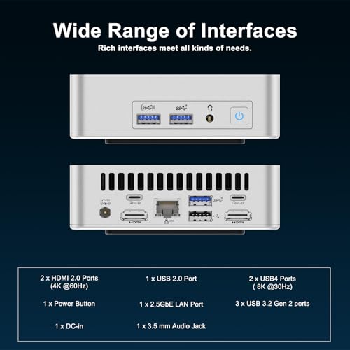 - 【دعم شاشة رباعية، حتى 8 كيه】كمبيوتر جيكوم الصغير مجهز بمنفذين يو اس بي 4.0 (يدعم DP1.4، 8K@30Hz) ومنفذي HDMI 2.0 (4K عند 60 هرتز)، مما يجعله قادرًا على دعم شاشتي 8K وشاشتين بدقة 4K في وقت واحد (إجمالي أربع شاشات). مع معدل نقل يصل إلى 40 جيجابت في الثانية، يسمح منفذ USB4 بالشحن السريع وقيادة شاشات متعددة والاتصال بمحركات خارجية، كل ذلك من خلال منفذ واحد