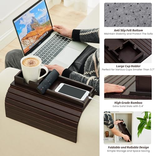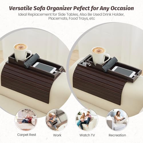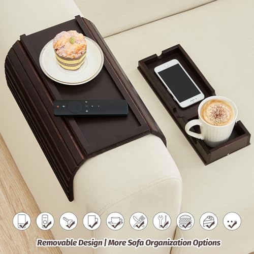 GEHE - جي اي حامل اكواب للاريكة قابل للازالة، حامل مشروبات مضاد للسقوط، حامل اكواب من الخيزران، صينية مسند ذراع للكنبة اكثر امانا لعائلتك، طاولة صينية بذراع الاريكة المحمولة للتحكم عن بعد/الوجبات الخفيفة