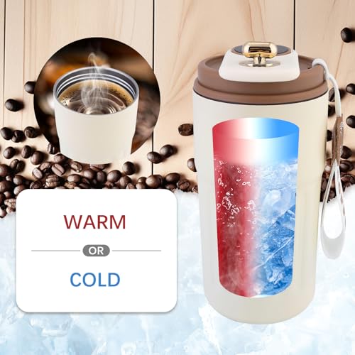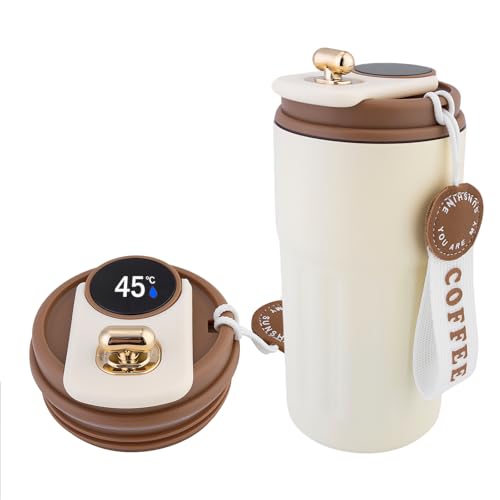 GENDLTHIJ - كوب قهوة من الستانلس ستيل مع شاشة عرض درجة الحرارة، كوب قهوة للسفر، كوب قهوة ذكي معزول للسفر، كوب قهوة محمول للسفر في الصيف، كوب قهوة ذكي للسيارة من جيندلتيج (ابيض وبني)