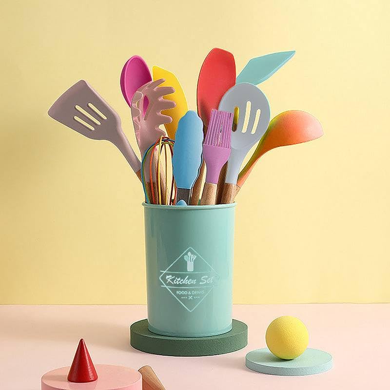 Generic - جيني مجموعة ادوات مطبخ من السيليكون مكونة من 12 قطعة بمقابض خشبية، مجموعة ادوات طبخ ملونة، مجموعة تقديم مقاومة للحرارة مع حامل تخزين