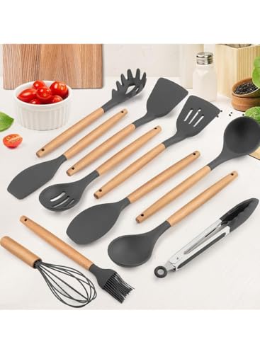 generic - جيني مجموعة ادوات مطبخ سيليكون 12 قطعة بمقابض خشبية - ادوات طبخ مقاومة للحرارة وغير لاصقة بما في ذلك ملعقة ومغرفة وخفاقة وملقط وحامل - ادوات طهي فاخرة - متعددة الالوان