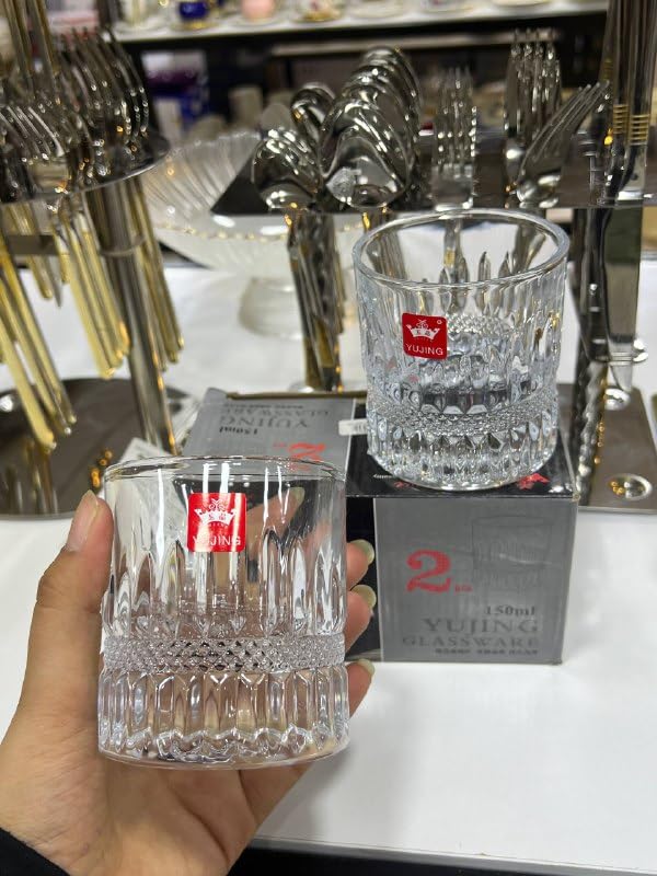 - تصميم فاخر مقطوع بالكريستال: يتميز بنمط هندسي أنيق مقطوع بالكريستال يعكس الضوء بشكل جميل، مما يضيف الرقي إلى الويسكي أو الكوكتيلات أو المشروبات