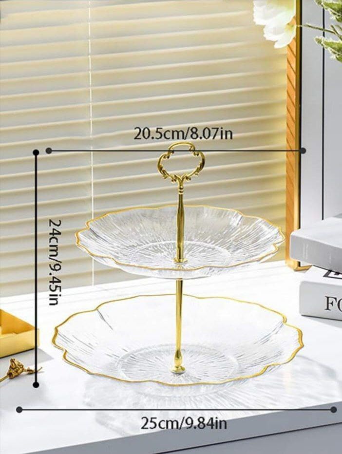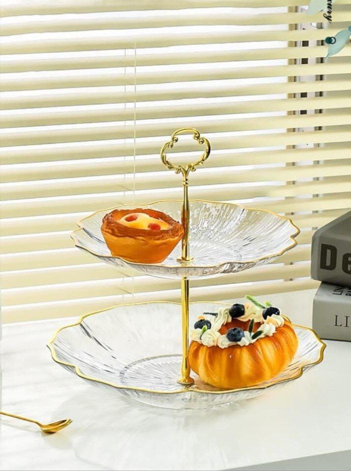 - تصميم أنيق: حامل تقديم من الاكريليك 2 مستوى مع حواف صدفية ومقبض ذهبي فاخر، مثالي لعرض الحلويات والمقبلات.