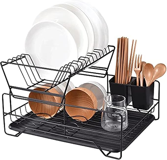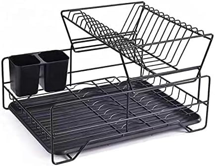 Generic - رف تجفيف الأطباق من طبقتين، مجموعة مصفاة مطبخ مع حامل أدوات طعام، 60 × 45 × 15 سم، أسود