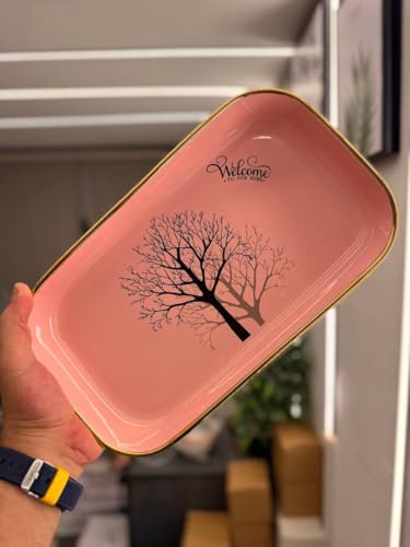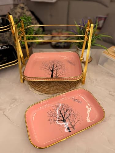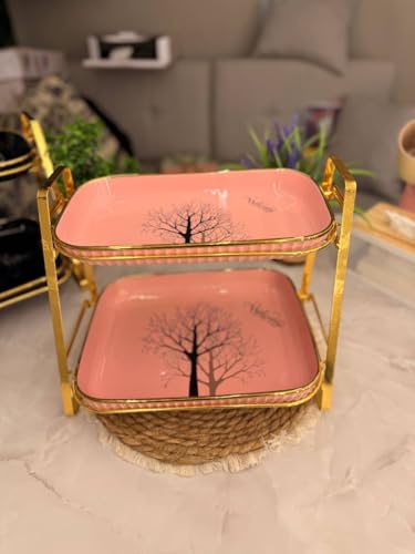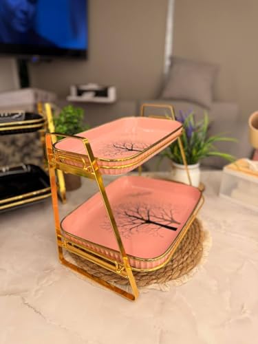- تصميم أنيق: حامل تقديم من طبقتين يضم أطباقًا من البورسلين الوردي مع تصميم شجرة سوداء وحافة ذهبية فاخرة لتقديم راقٍ.