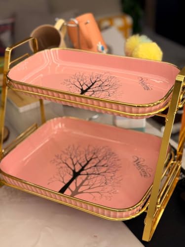 Generic - حامل حلويات بورسلين طبقتين، وردي بتصميم شجرة وحافة ذهبية، 35 × 30 سم