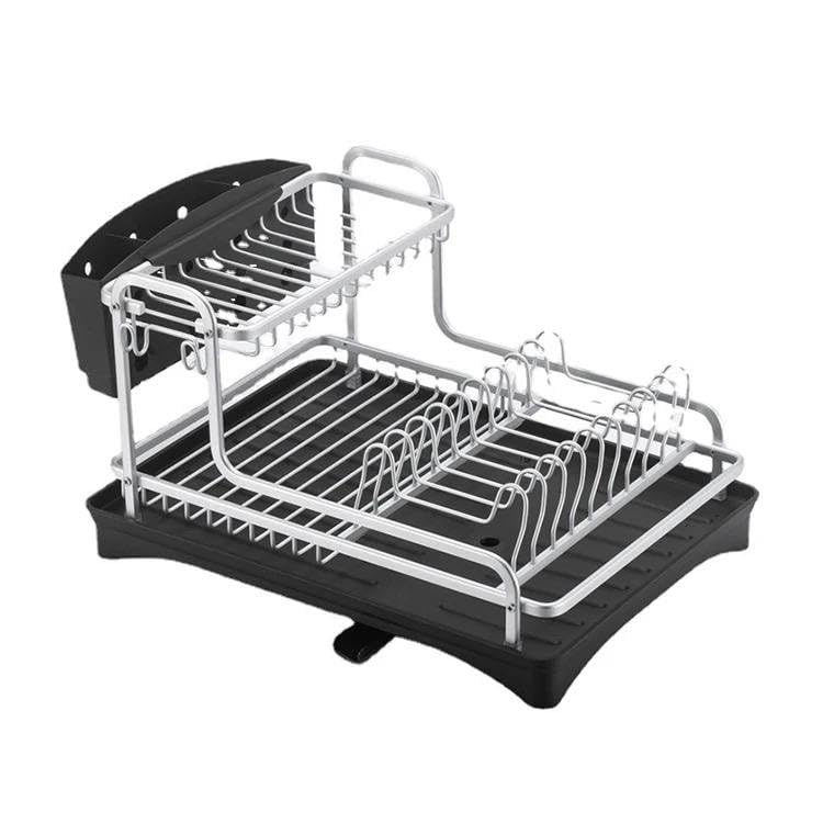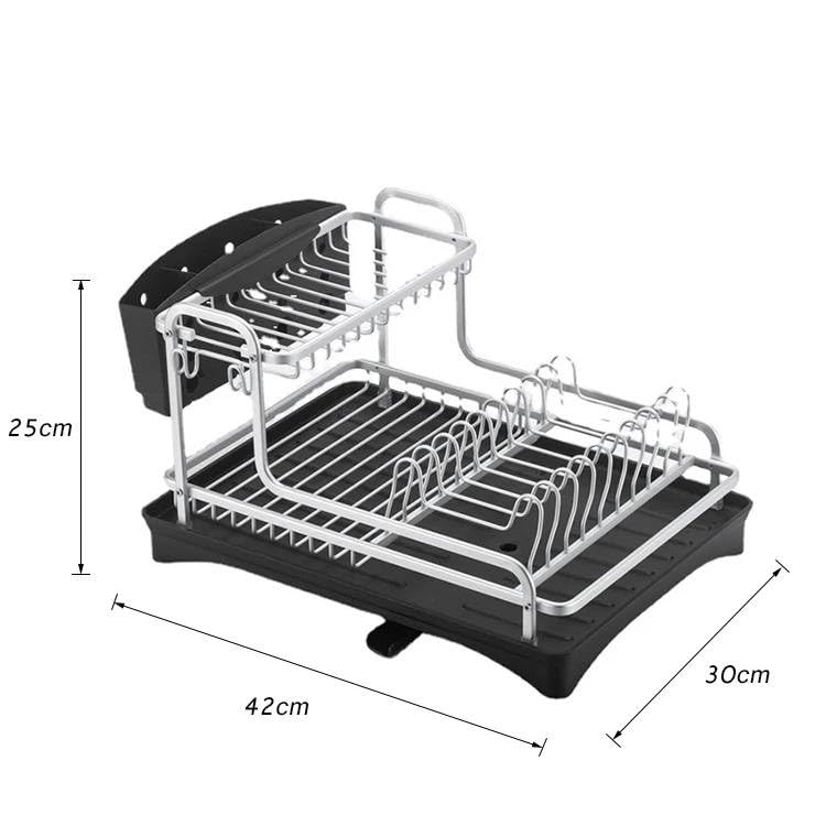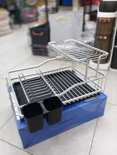 Generic - رف تجفيف أطباق من الفولاذ المقاوم للصدأ مكون من طبقتين مع لوح تصريف، حامل أطباق بسعة كبيرة مع حامل للأواني، لون أسود وفضي mk