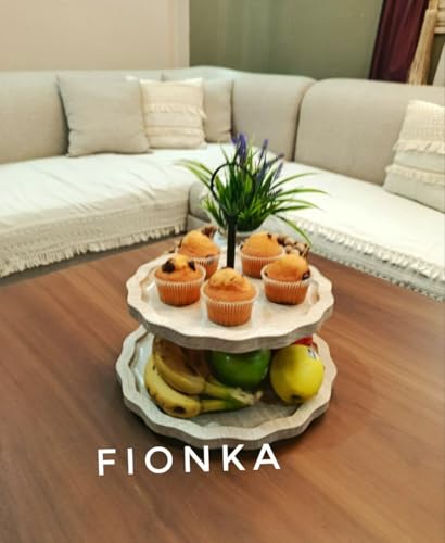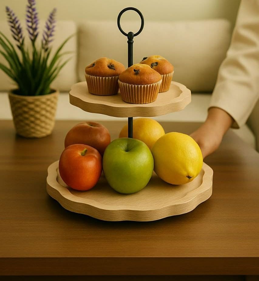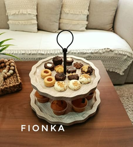 - تصميم أنيق: حامل تقديم خشبي من مستويين، بحواف مموجة ومقبض معدني متين، مثالي لعرض الحلويات والوجبات الخفيفة بتصميم أنيق.
