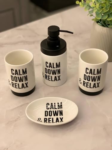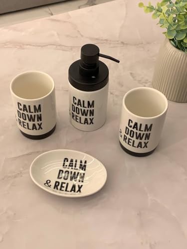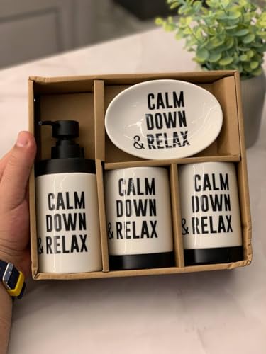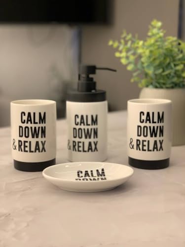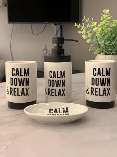 - مجموعة كاملة: طقم حمام بورسلين حديث مكون من 4 قطع بما في ذلك موزع صابون، وحامل فرشاة أسنان، وصبانة بتصميم "Calm Down & Relax".