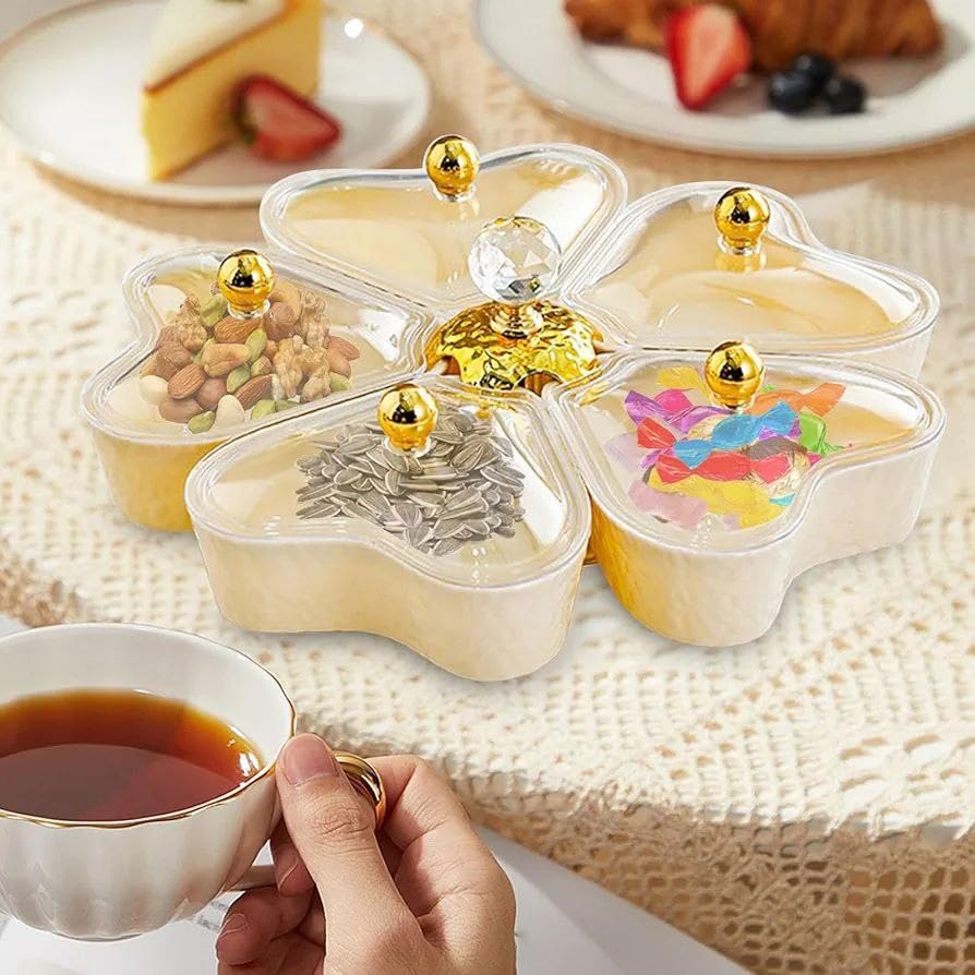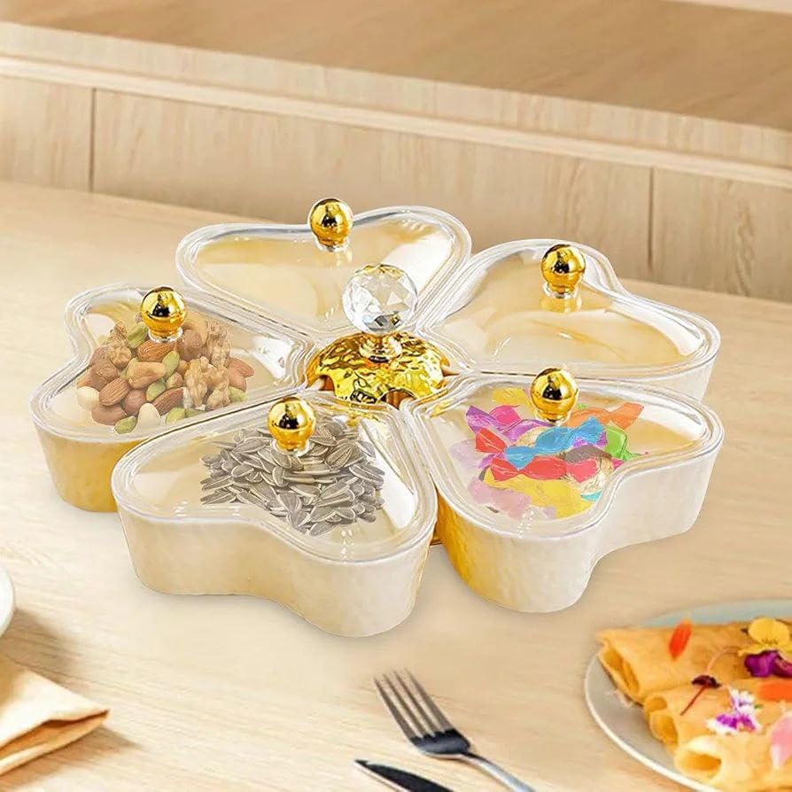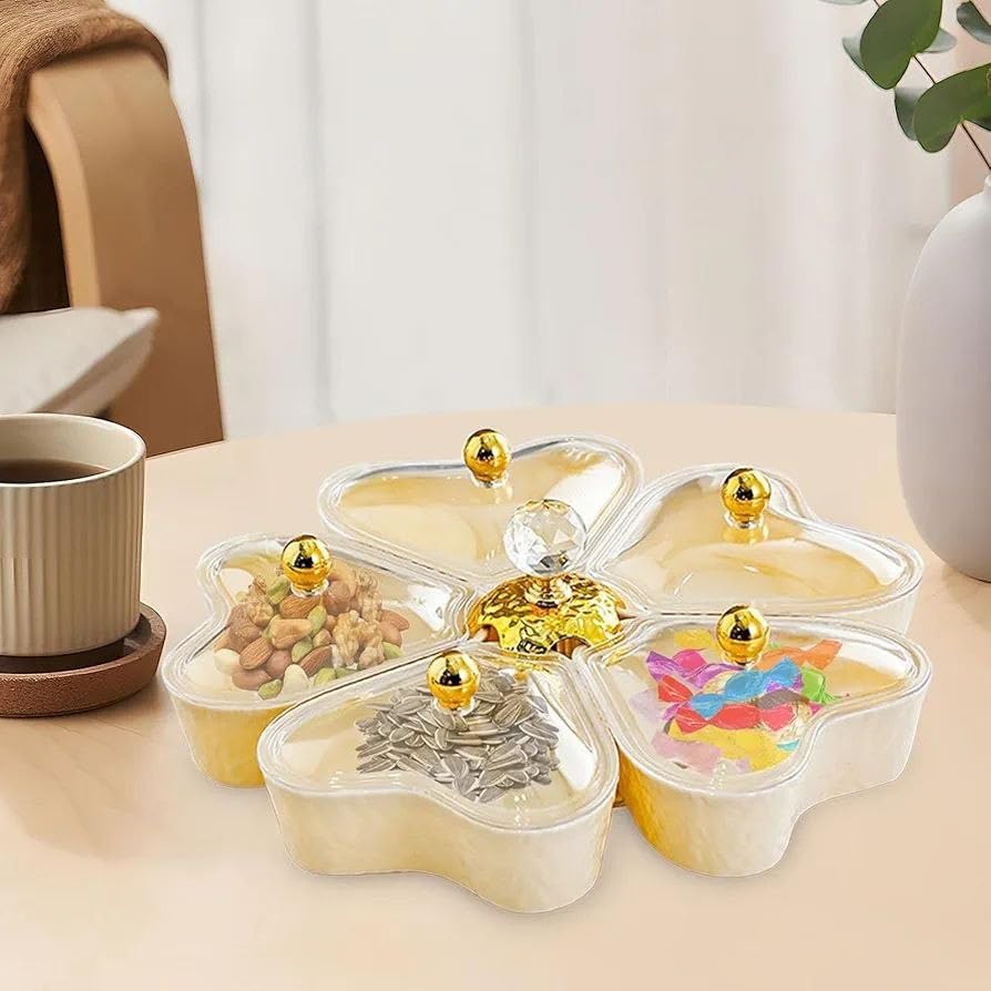 - تصميم أنيق: صينية تقديم دوارة فريدة من نوعها على شكل زهرة مع 5 مساحات تخزين على شكل قلب وأغطية مزخرفة باللون الذهبي، تتميز بلمسة نهائية بيضاء لامعة تضيف الرقي إلى أي طاولة