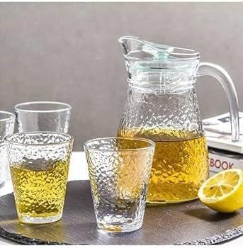 - مجموعة كاملة من 5 قطع: تتضمن إبريق زجاجي سعة 2 لتر مع مقبض مريح وأربعة أكواب عصير متطابقة، مثالية لتقديم المشروبات للعائلة والضيوف