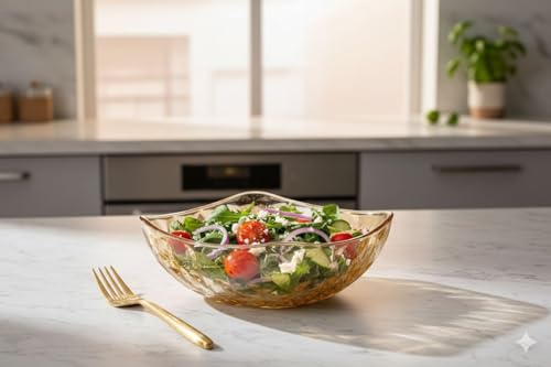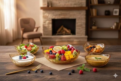 - هيكل زجاجي فاخر: تتميز مجموعة الأوعية المكونة من 5 قطع بزجاج عالي الجودة مع ملمس قرص العسل المميز ولون العسل الدافئ الذي يضيف الأناقة إلى أي طاولة